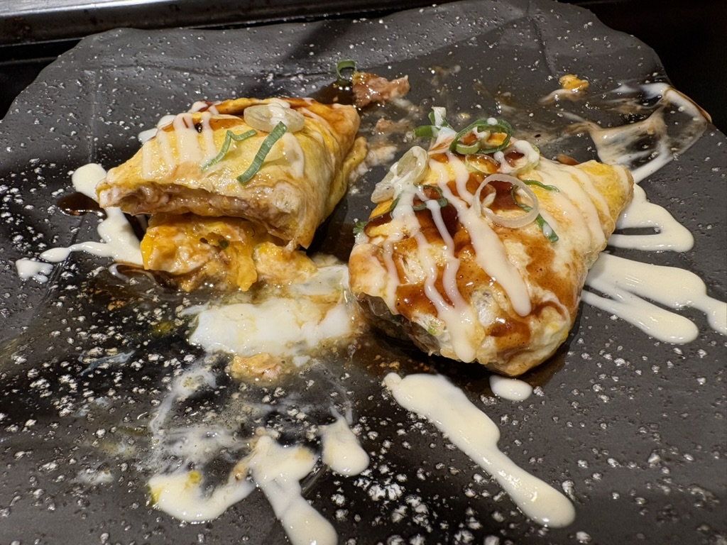 お好み焼きと並んでぜひ試してほしいのがとんぺい焼き。卵でふんわりと包んだこの一品、マヨネーズとソースがたっぷりかかっていて、ひと口食べると幸せな気持ちになれます。