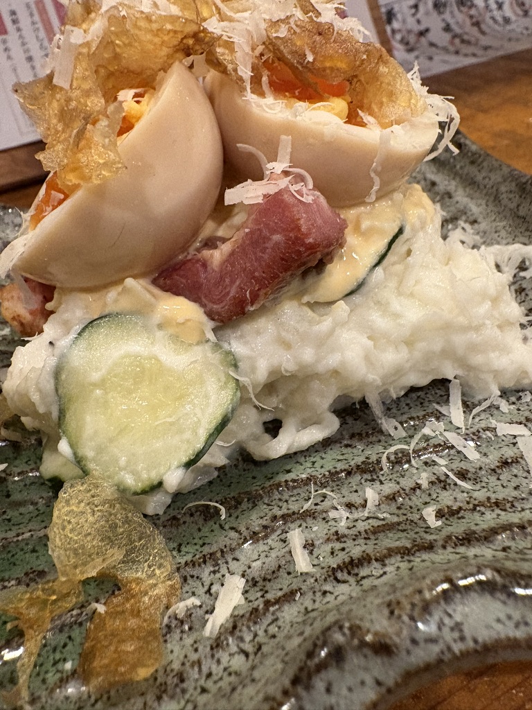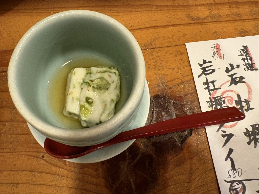 まず目を引いたのが、青磁の器に盛られた岩牡蠣の冷奴風。湯葉をのせた上品な一皿は、視覚からも楽しませてくれます。お皿のセンスが料理の格をひとつ上げているのがよくわかる一品で、日本酒との相性も抜群でした。