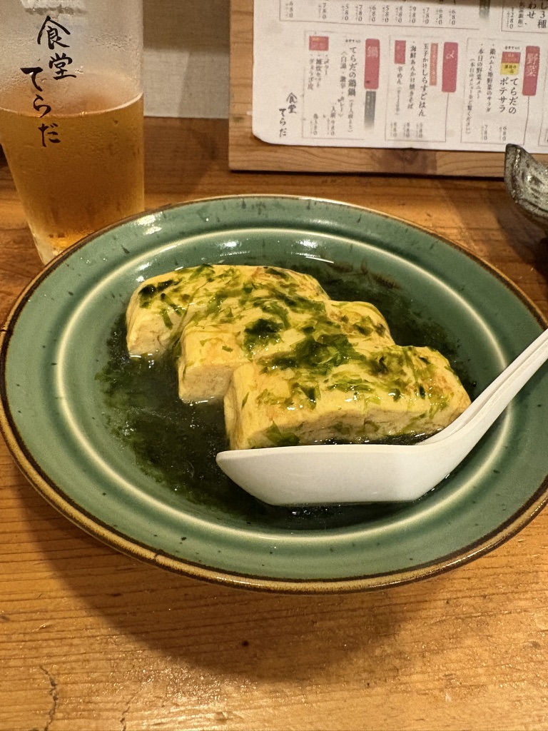 緑のお皿に盛られた豆腐料理も、シンプルながらひと手間かかった丁寧な仕上がり。食堂てらだの料理は、どれも器と料理が一体となった芸術作品のよう。「何を食べようか」ではなく、「どのお皿が来るのかな」という楽しみも加わります。