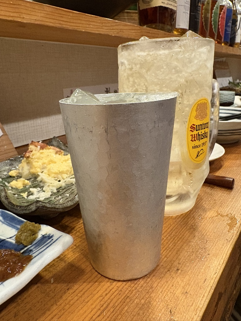 〆はスズ製のカップでいただくハイボール。サントリーウイスキーのハイボールは、スズカップの冷たさがひんやりと手のひらに伝わり、格別の美味しさ。お皿だけでなくグラスにもこだわる食堂てらだらしい、粋な演出です。