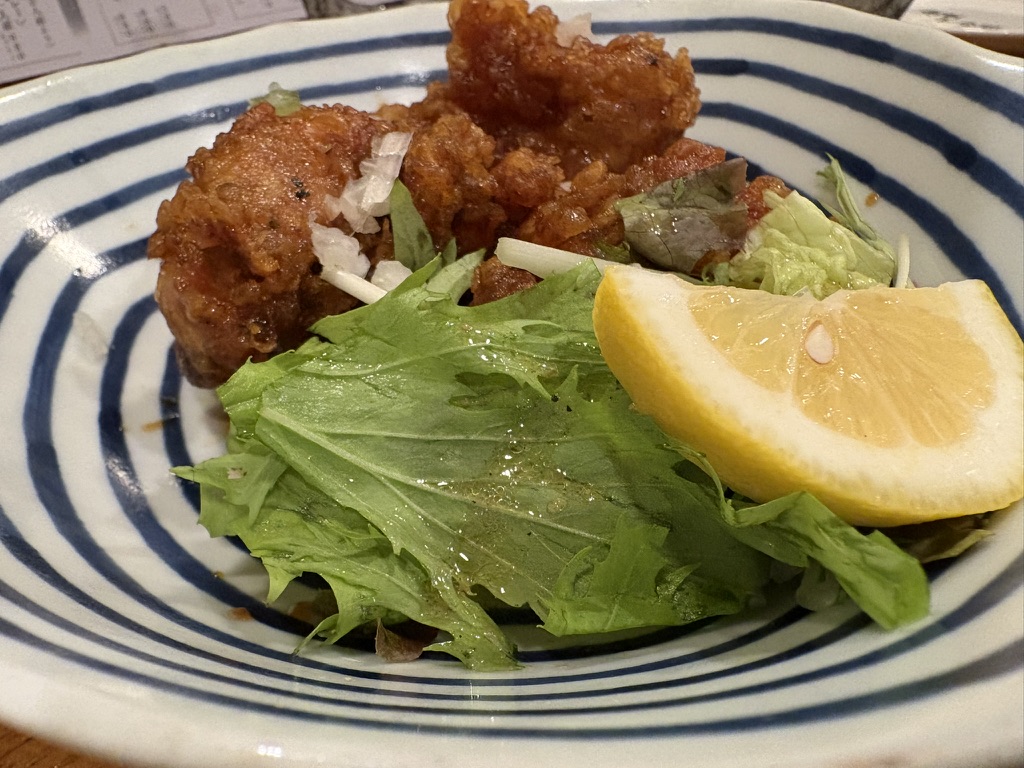 唐揚げは青と白のストライプ皿で登場。外はカリッと、中はジューシーな仕上がりで、ビールとの相性は言わずもがな。家庭的でありながら、しっかりとした仕事を感じるひと皿です。